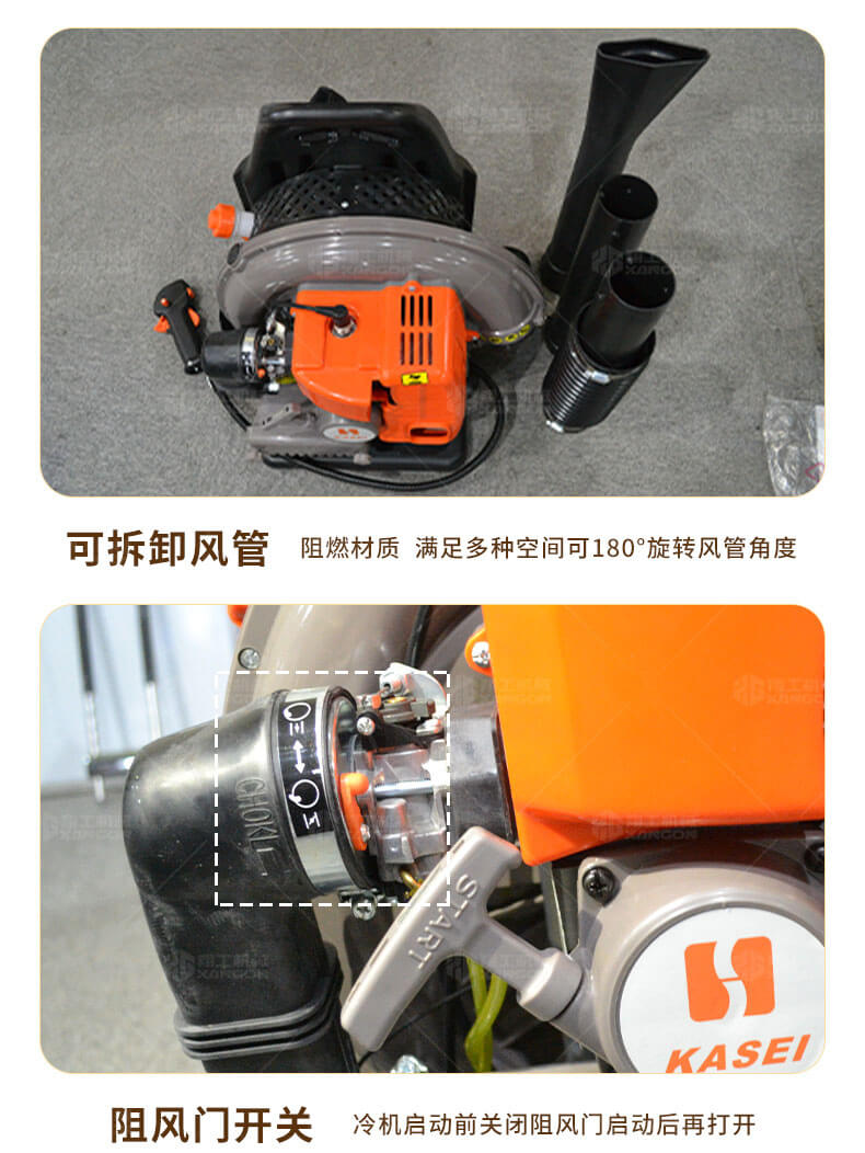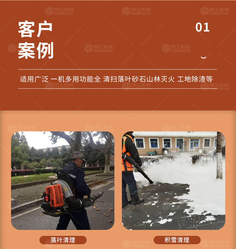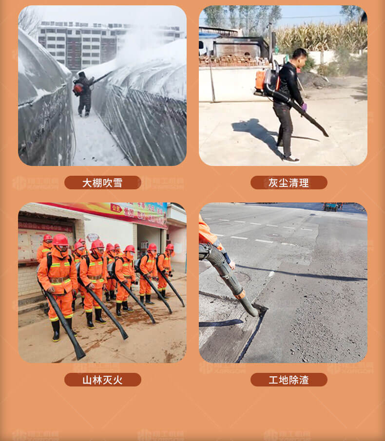 本機適用于修公路吹灰塵和吹雪,吹雪厚度達到15公分以上,鐵路上吹沙子,萊大柵溥膜上和露天的變壓器上吹雪(露天變壓器上吹雪時,需再配2.8米的伸縮噴風管)。公園內吹落葉,院子內吹雪及森林防火等.