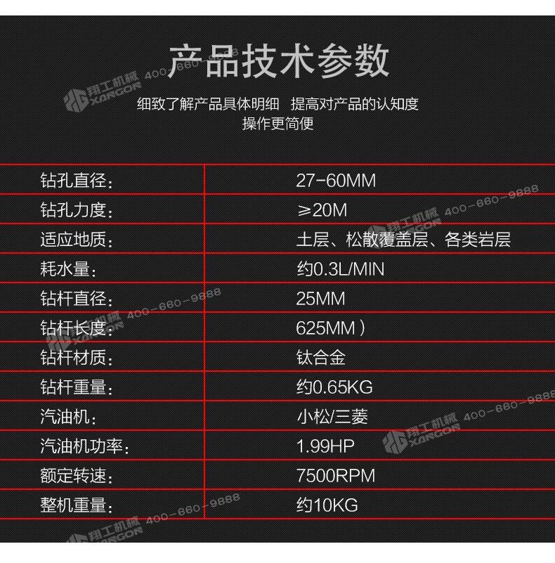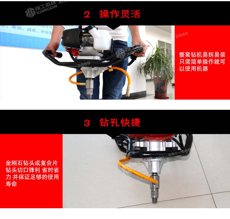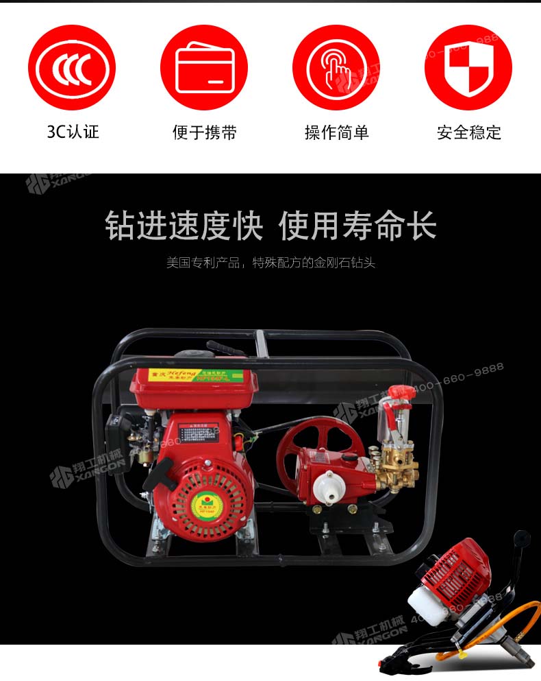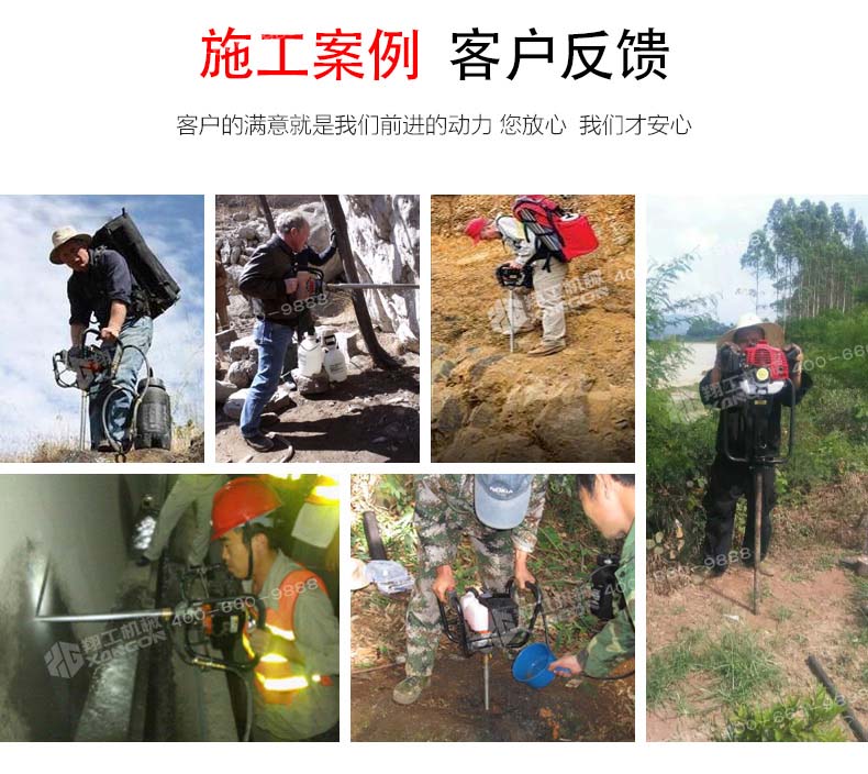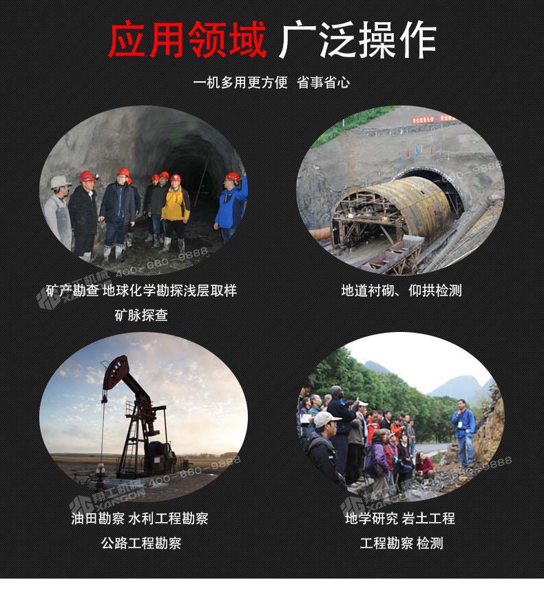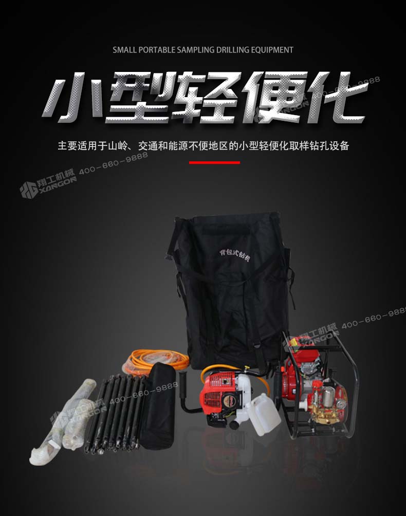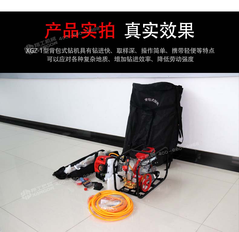 XGZ-1型背包式鉆機具有鉆進快、取樣深、操作簡單、攜帶輕便等特點,可以應對各種復雜地質、增加鉆進效率、降低勞動強度,適用于高山、野外等交通不便的地形、勘探、石油勘測、礦物考察、建筑取樣、爆裂鉆孔等工作,可以卓效的替代中型巖芯鉆機的淺層巖芯取樣勘探工作。