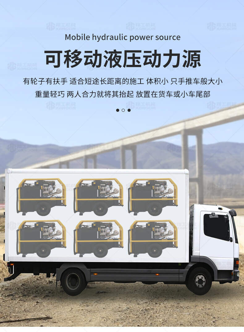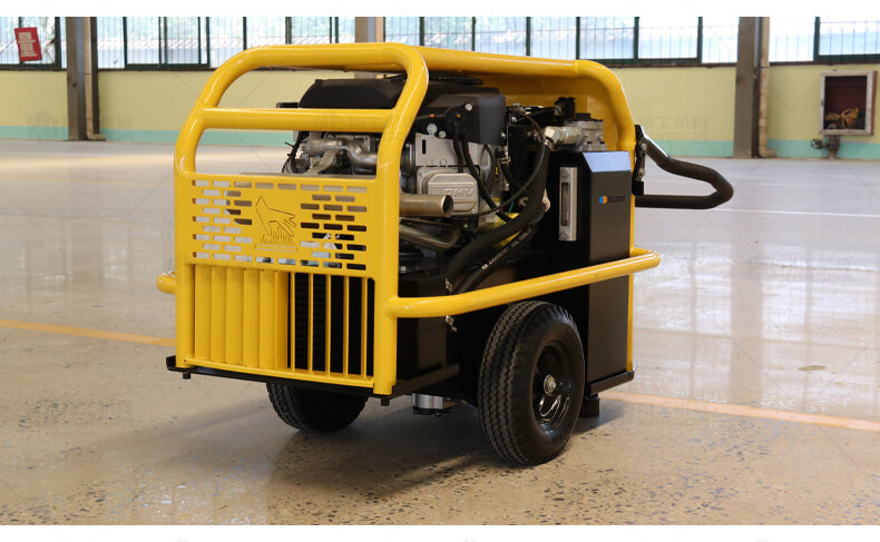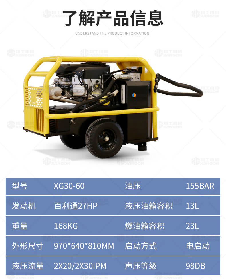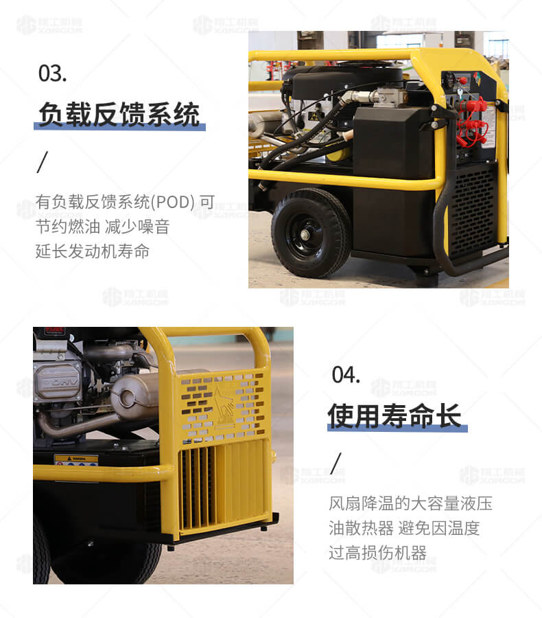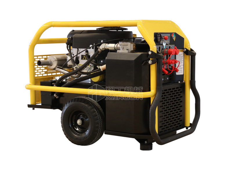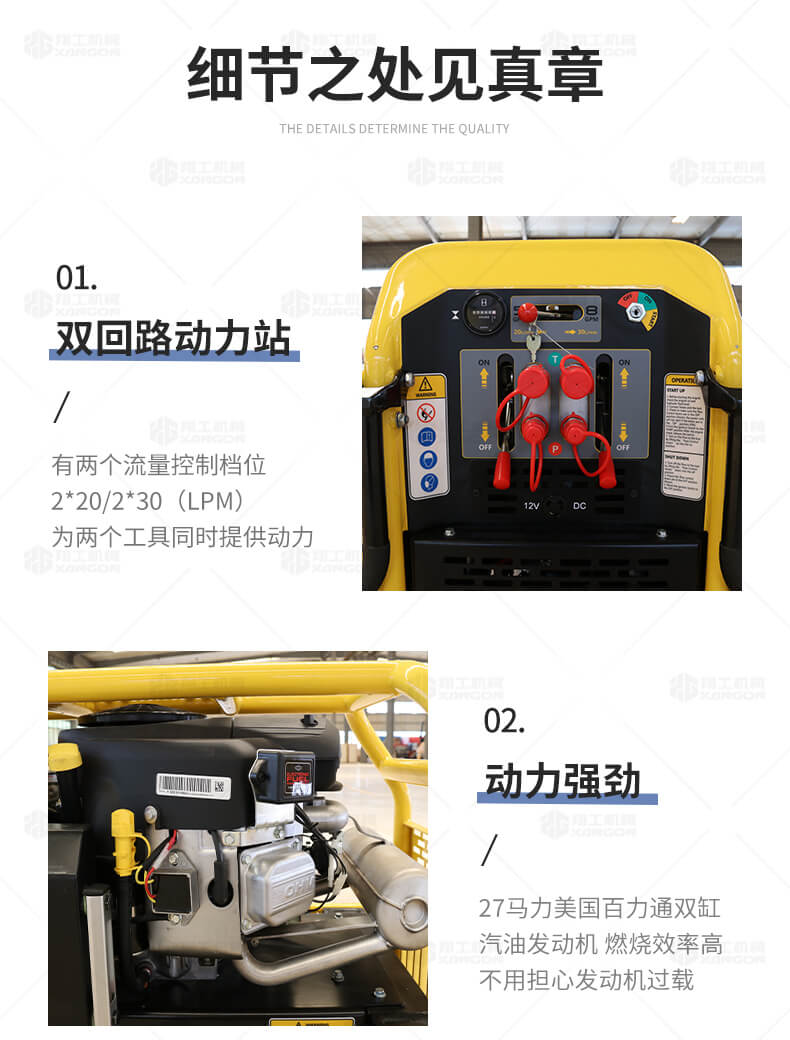 1.雙回路動力站,有兩個流量控制檔位2*20/2*30(Lpm),為兩個工具同時提供動力; 2.27馬力美國百力通雙缸汽油發動機; 3.電啟動; 4.可折疊扶手的護框和移動輪; 5.風扇降溫的大容量液壓油散熱器; 6.有負載反饋系統(POD),可節約燃油、減少噪音、延長發動機壽命; 7.配有工作計時表。