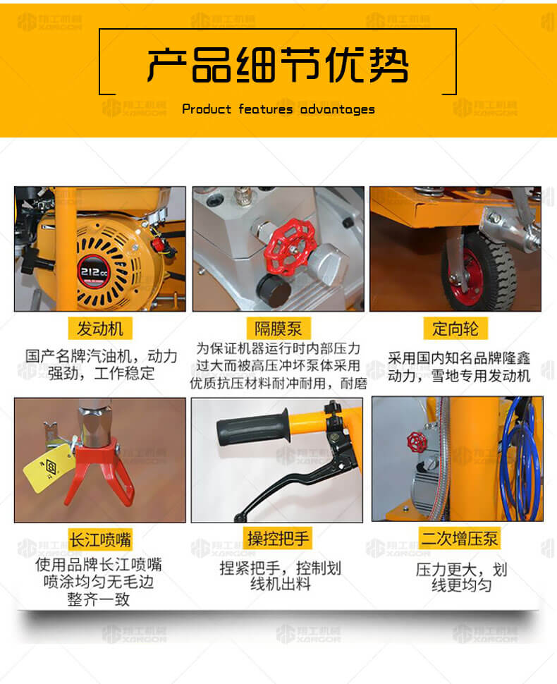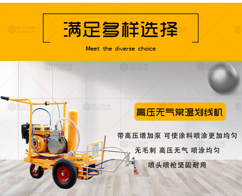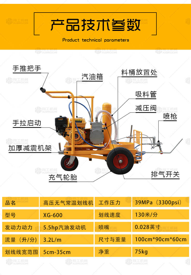 高壓無氣常溫劃線機利用汽油機驅動單注塞泵,使涂料在機內形成高壓進行噴涂,索劃線厚薄均勻邊角齊,噴槍架導向桿升降設計,調節噴涂寬度更為準確方便。該機器是常溫標線施工的專用設備,主要用于公路、停車場、機場、加油站、公司廠區等涂畫直線、虛線、曲線、斑馬線、文字、箭頭、圖形、標志等。