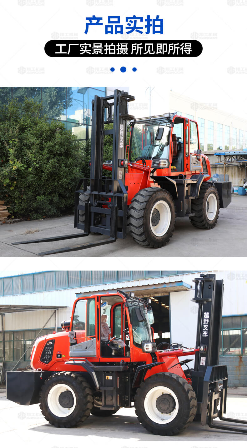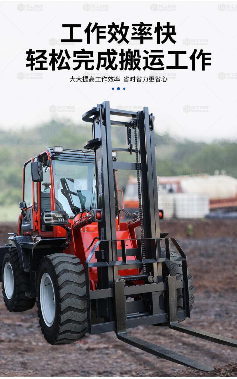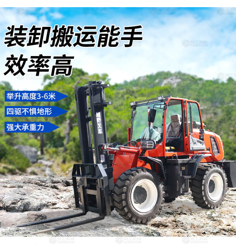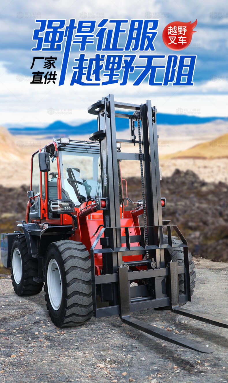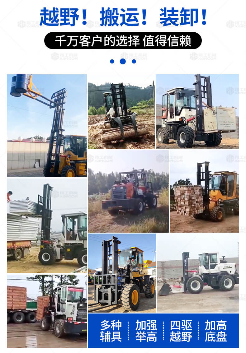 越野叉車可以在坡地和不平地面上進行貨物裝、卸、堆垛及搬運作業,具有良好的機動性、越野性可靠性。其功能多樣,可搭配側移器、調距叉、旋轉器、軟包夾、推出器、側翻叉、側翻斗、起重臂等工具完成不同的工作。