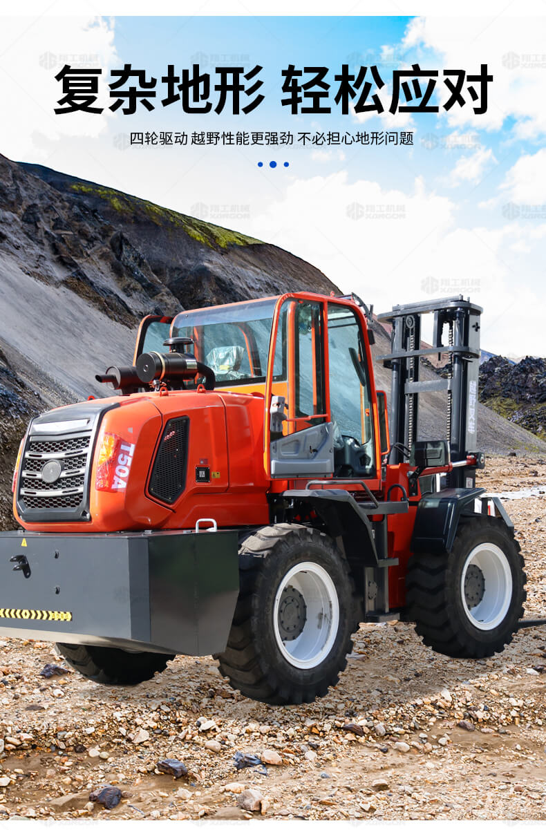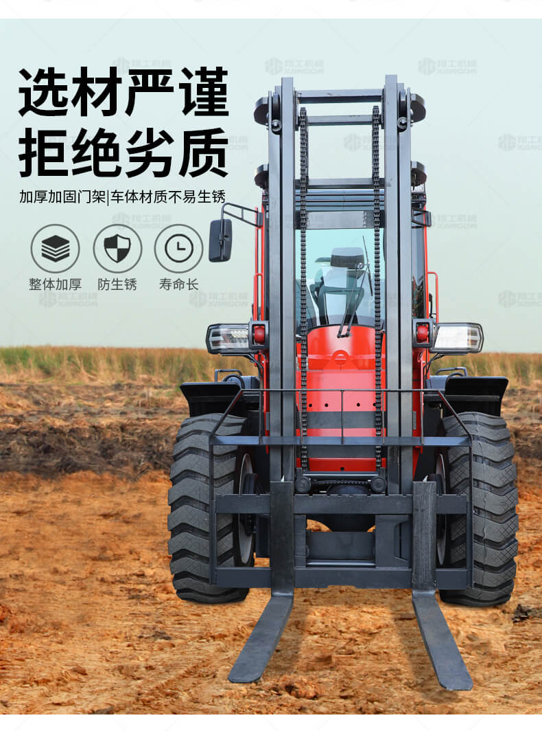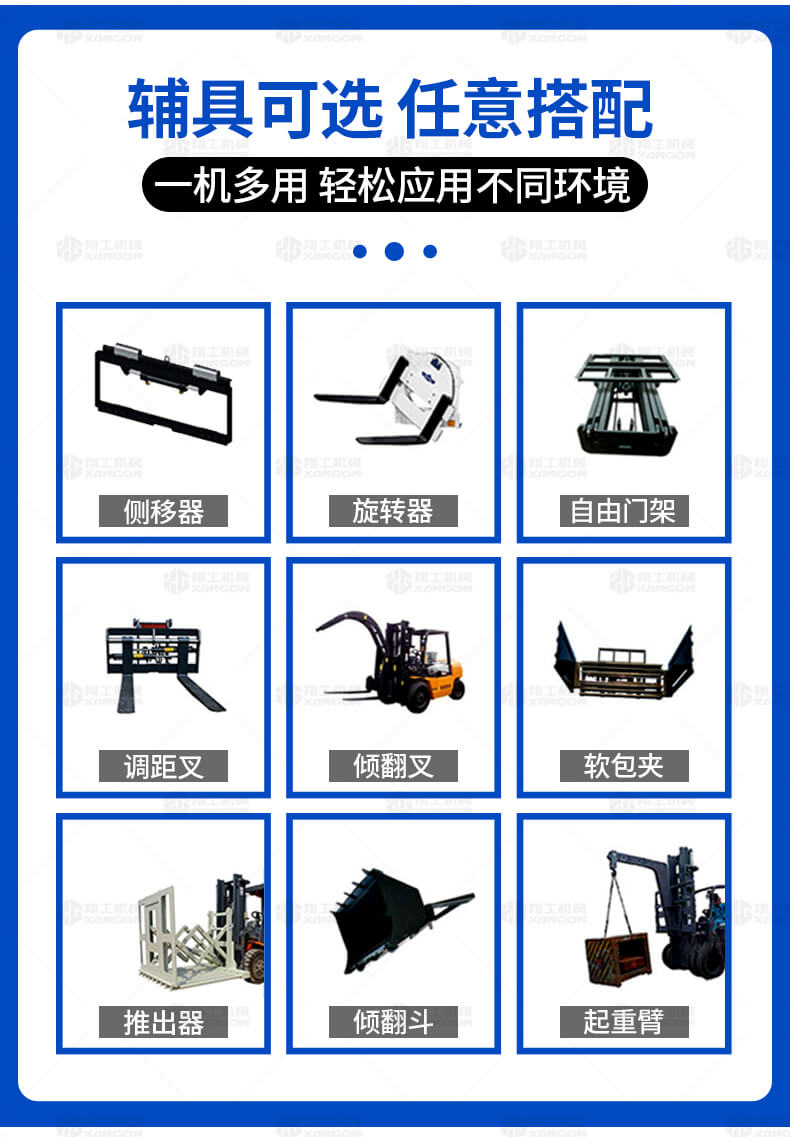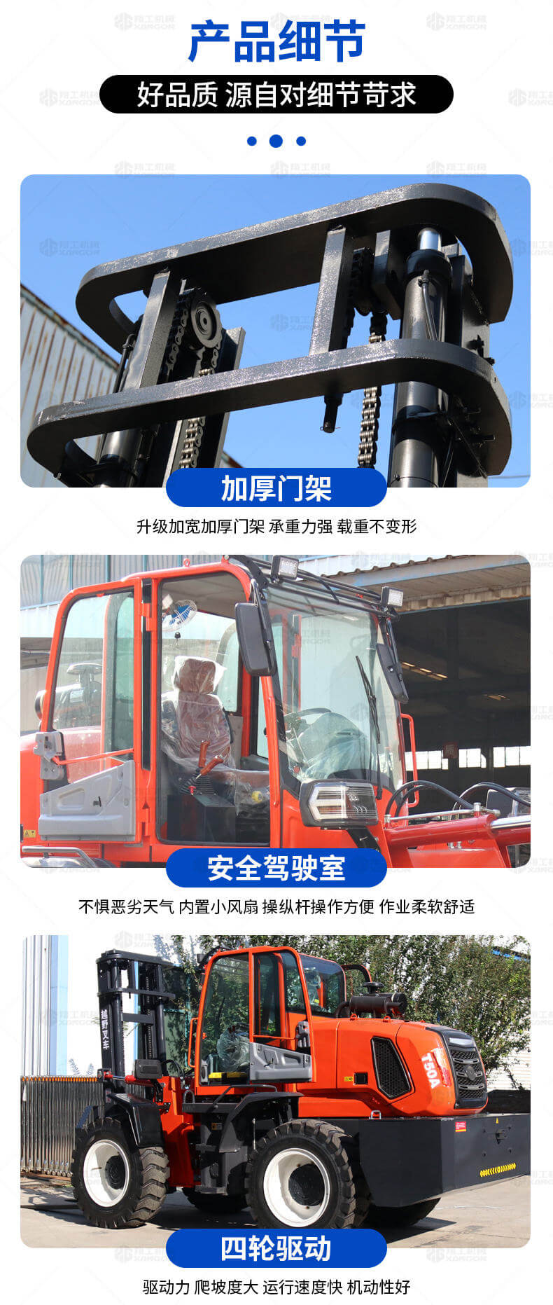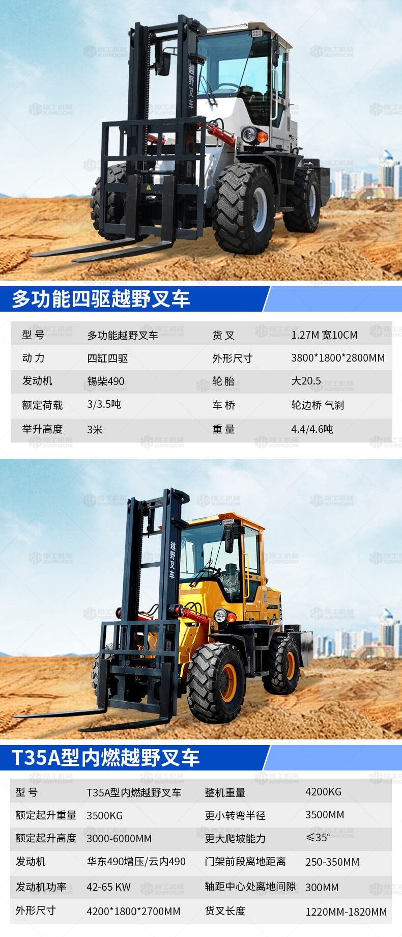 越野叉車可以在坡地和不平地面上進行貨物裝、卸、堆垛及搬運作業,具有良好的機動性、越野性可靠性。其功能多樣,可搭配側移器、調距叉、旋轉器、軟包夾、推出器、側翻叉、側翻斗、起重臂等工具完成不同的工作。