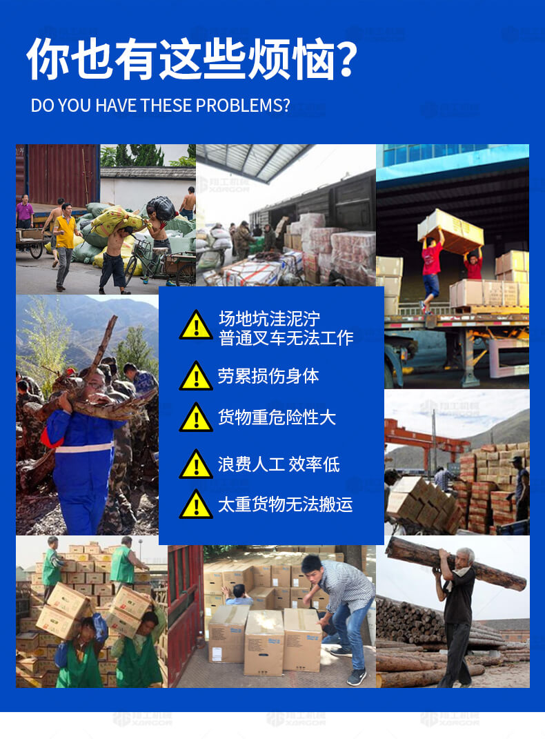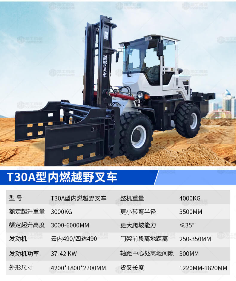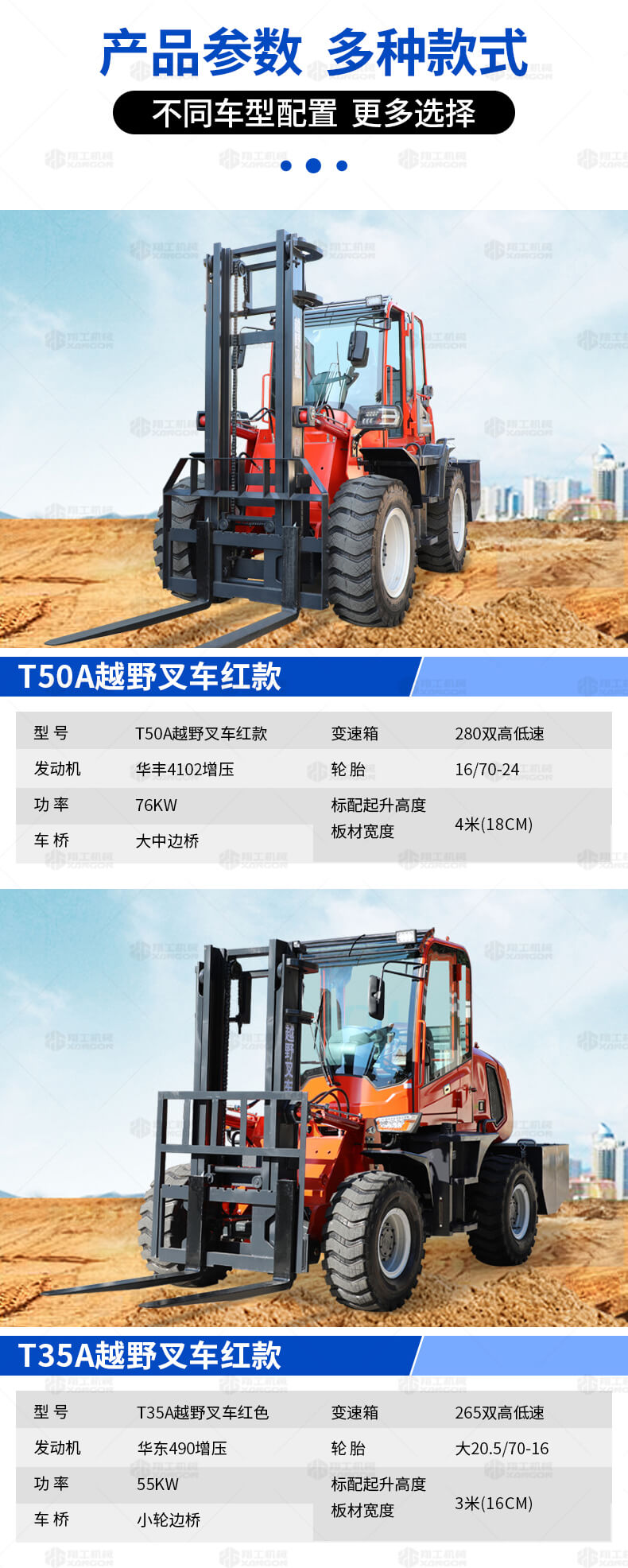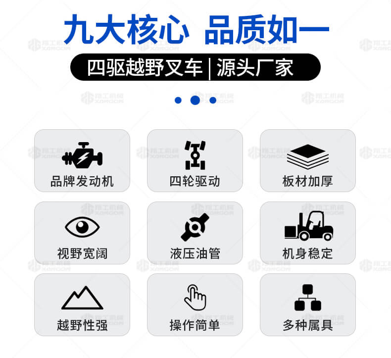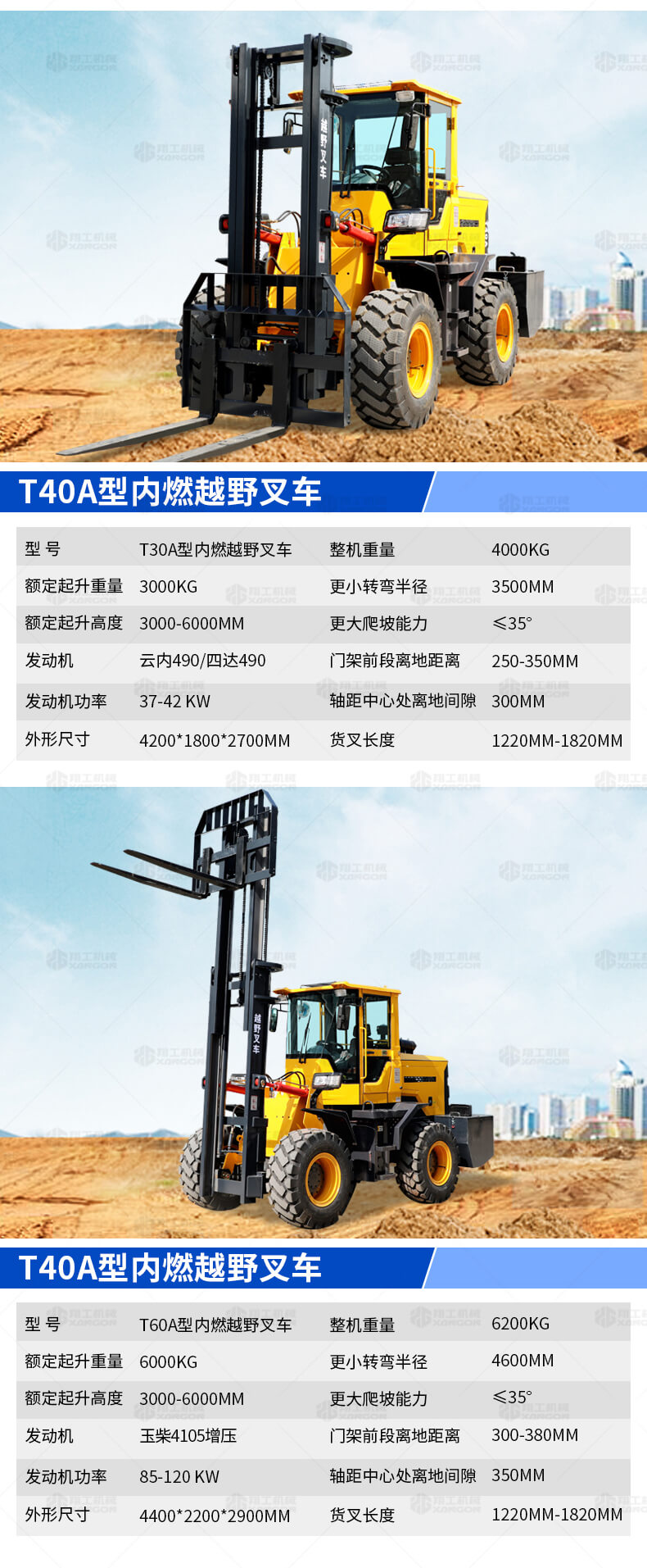 越野叉車可以在坡地和不平地面上進行貨物裝、卸、堆垛及搬運作業,具有良好的機動性、越野性可靠性。其功能多樣,可搭配側移器、調距叉、旋轉器、軟包夾、推出器、側翻叉、側翻斗、起重臂等工具完成不同的工作。