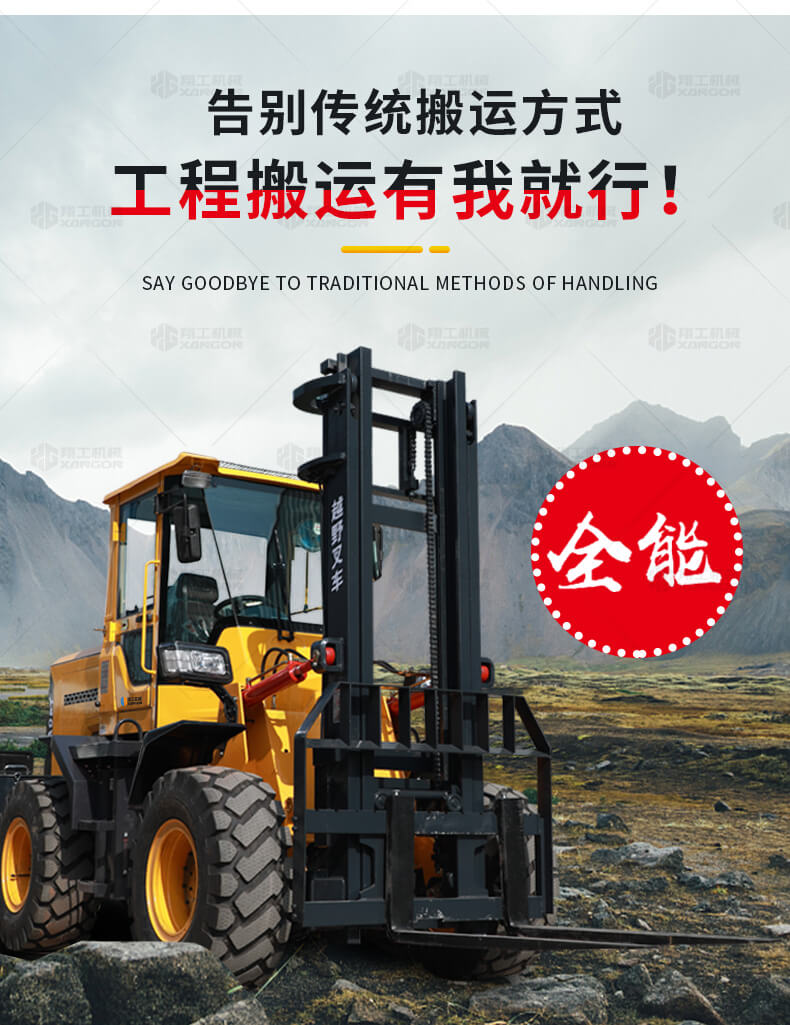 越野叉車可以在坡地和不平地面上進行貨物裝、卸、堆垛及搬運作業,具有良好的機動性、越野性可靠性。其功能多樣,可搭配側移器、調距叉、旋轉器、軟包夾、推出器、側翻叉、側翻斗、起重臂等工具完成不同的工作。