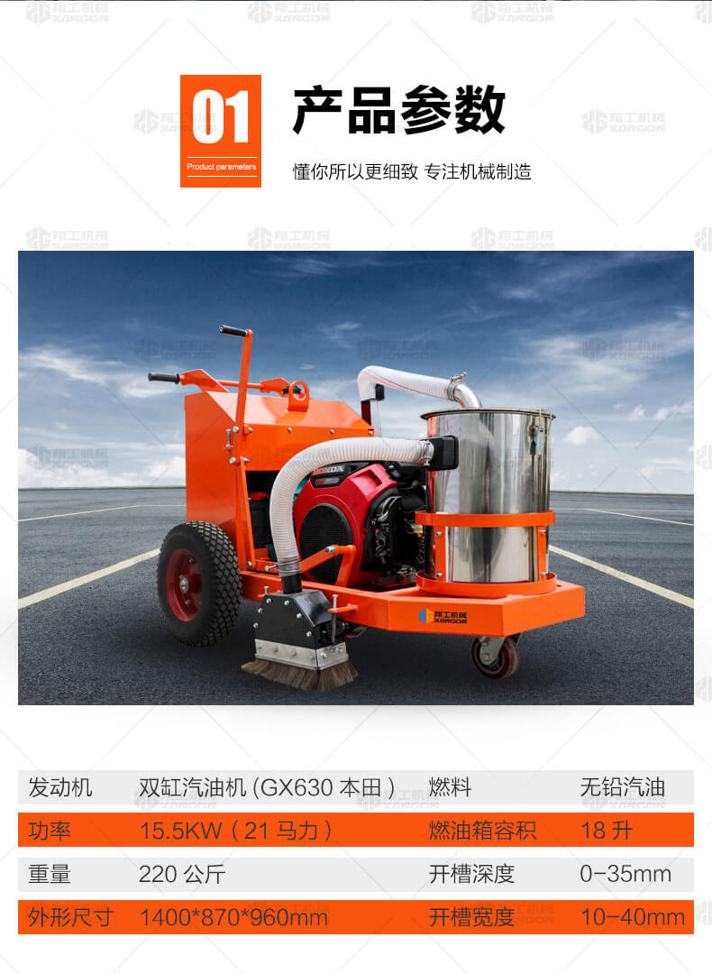 自吸塵式路面開槽機帶有吸塵功能,解決了傳統開槽機工作產生灰塵的問題,更加環保。我們這款路面開槽機是專門用于混凝土路面開槽的,性能優越,節能環保。