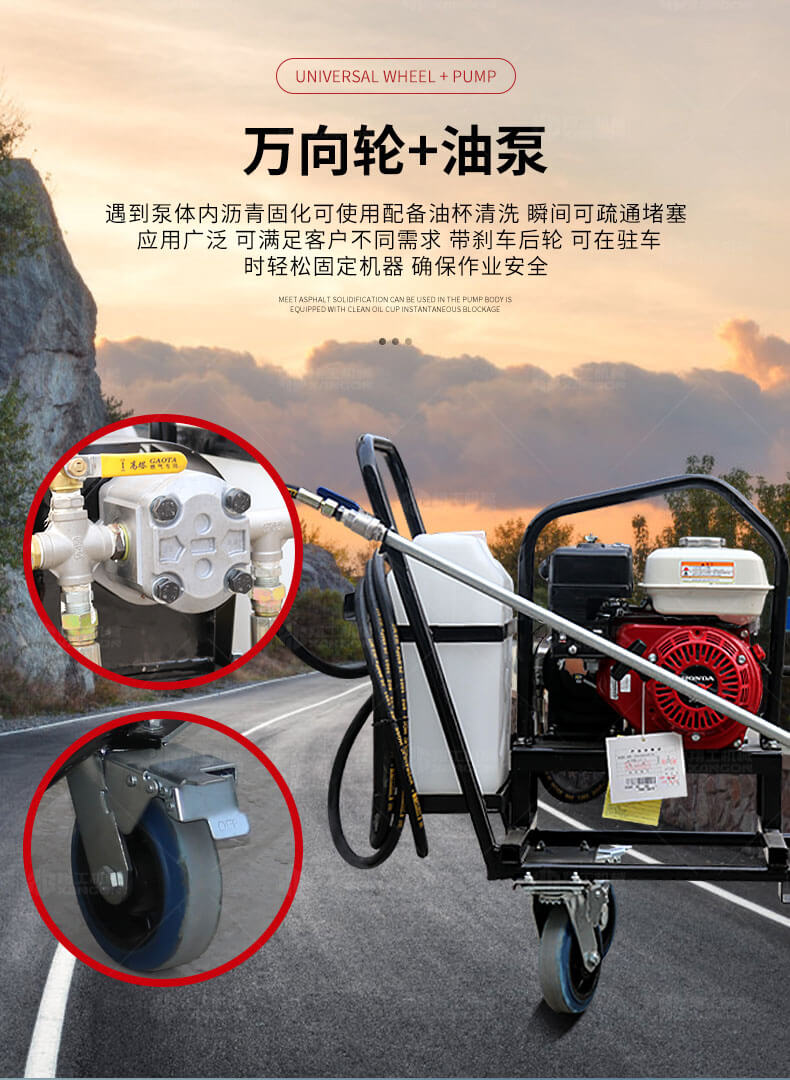 小型乳化瀝青撒布機用于修補瀝青道路上的坑槽,裂縫或?qū)磳⒗匣穆访孢M行表層噴層修復(fù)翻新,由于在養(yǎng)護瀝青道路時經(jīng)常需要對路面均勻噴灑乳化瀝青或防水材料。