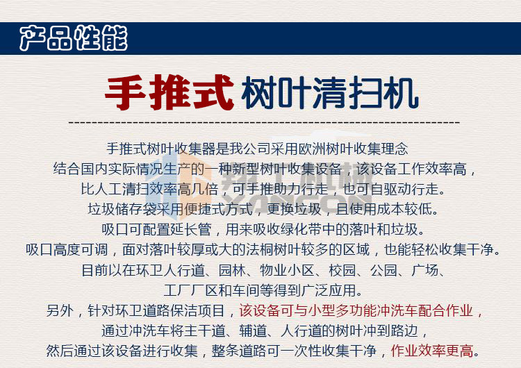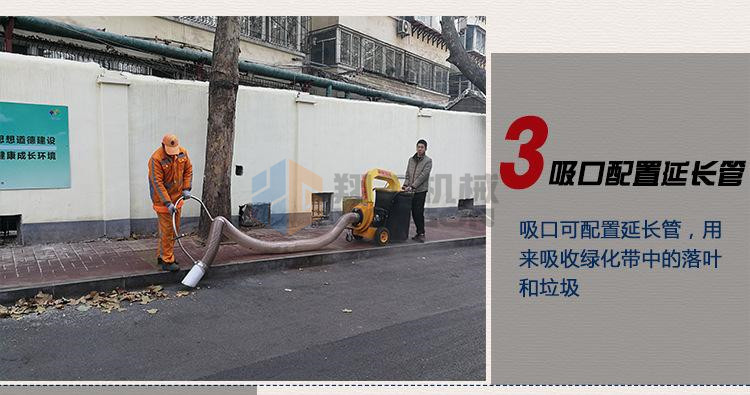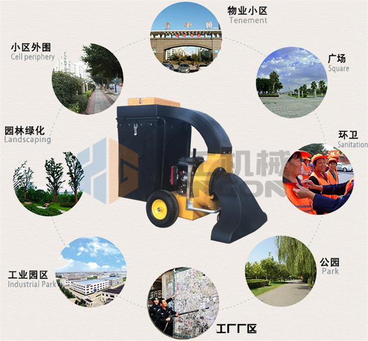 該設備工作效率高,比人工清掃效率高幾倍,可手推助力行走。垃圾儲存袋采用便捷式方式,便于更換垃圾,且使用成本較低。吸口可配置延長管,用來吸收綠化帶中的落葉和垃圾。吸口高度可調,面對落葉較厚或大的法桐樹葉較多的區域,也能輕松收集干凈。目前以用在環衛人行道、園林、物業小區、校園、公園、廣場、工廠廠區和車間等得到廣泛應用。