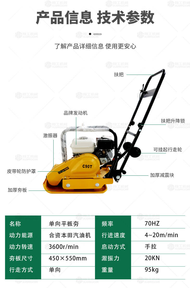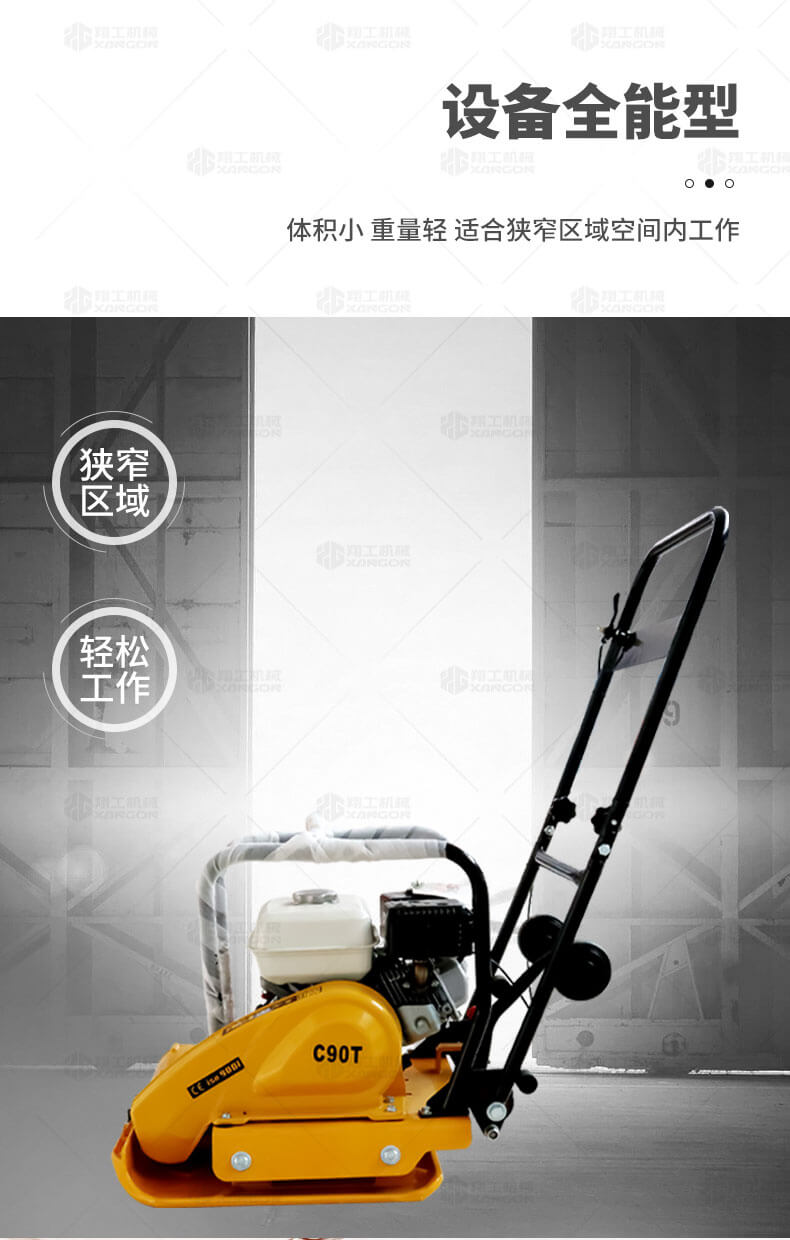 C90T單向平板夯適用于路基邊緣、橋涵、管道、溝槽底部等狹長地帶的壓實。HONDA動力,性能優越,啟動容易。采用單獨懸掛式強力減震機構,減少對發動機的沖擊,提高操作人員的舒服感。