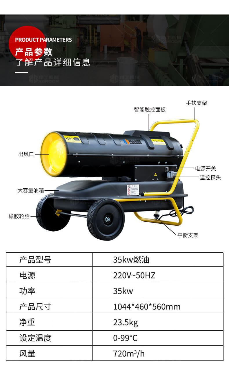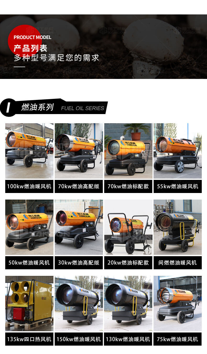 35KW燃油暖風機適合在工廠車間,物資倉庫,防潮烘干,局部采暖 建筑工地,道路橋梁,水泥養護,野外采暖 石油鉆井,煤炭礦區,除冰防凍,設備保溫 鐵路機場,游艇船舶,油漆干燥等等。