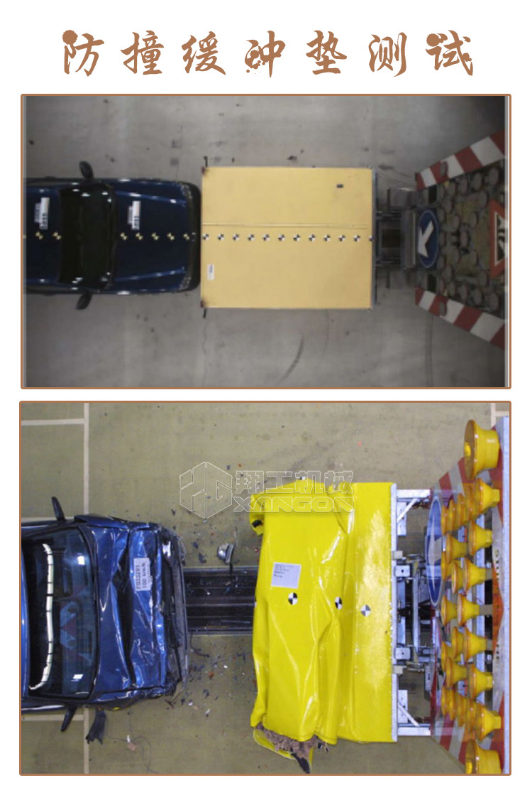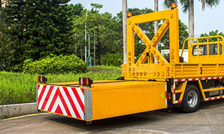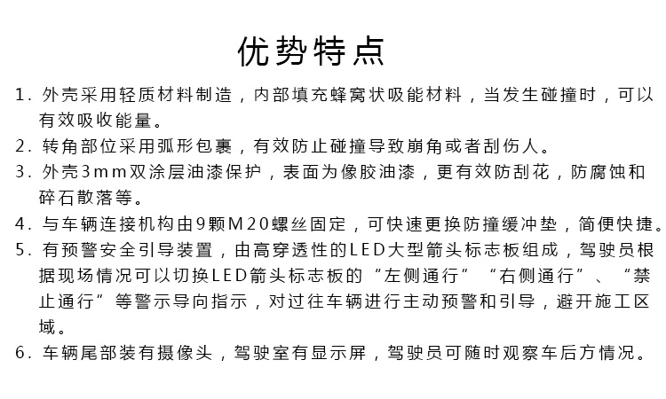 應用于道路養護施工作業、清掃保潔、灑水、綠化修剪、路面事故巡查等工況的安全防護。置于道路車輛、設備后方,在發生追尾事故中充當肇事車輛和施工作業人員或設備的緩沖區域,降低對人員的傷害。