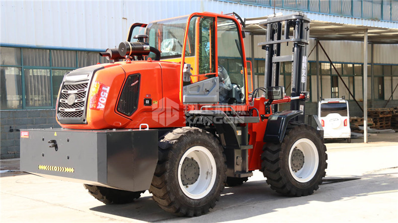 9.越野叉車杰出的離地間隙,特制的越野輪胎。前橋帶防滑差速裝置的四輪驅動。使發動機與變速箱之間上設計的更加緊湊。能夠在惡劣的地區如崎嶇地形,沙地和泥地上作業。