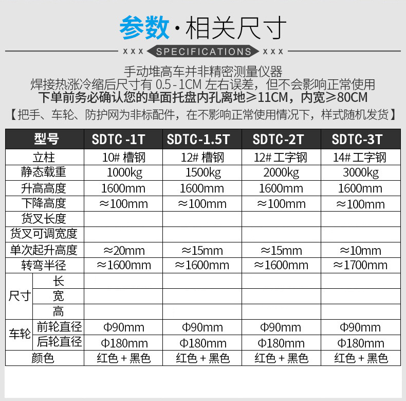 10、可腳踩或手搖兩種方式,控制貨叉起升高度,1.6米、1.8米、2米、3米、3.5米等多種規格,自由掌控升高;