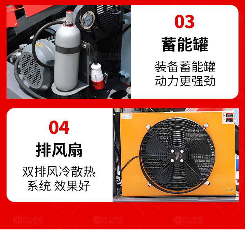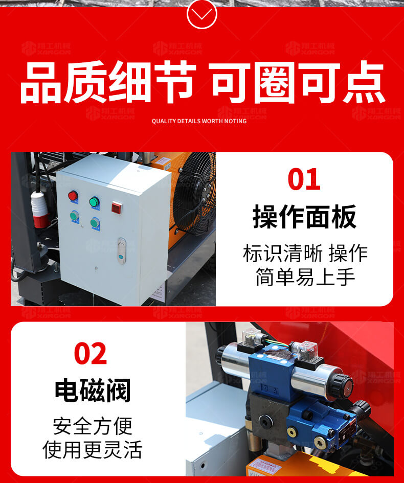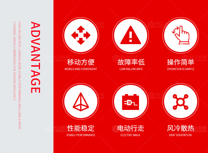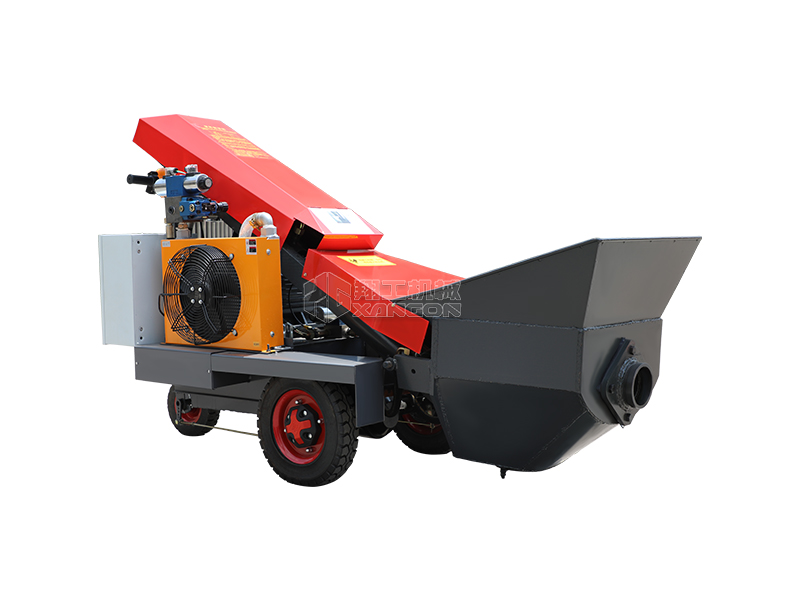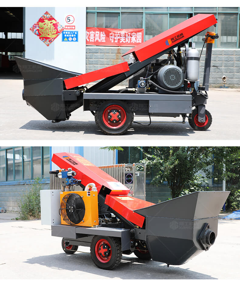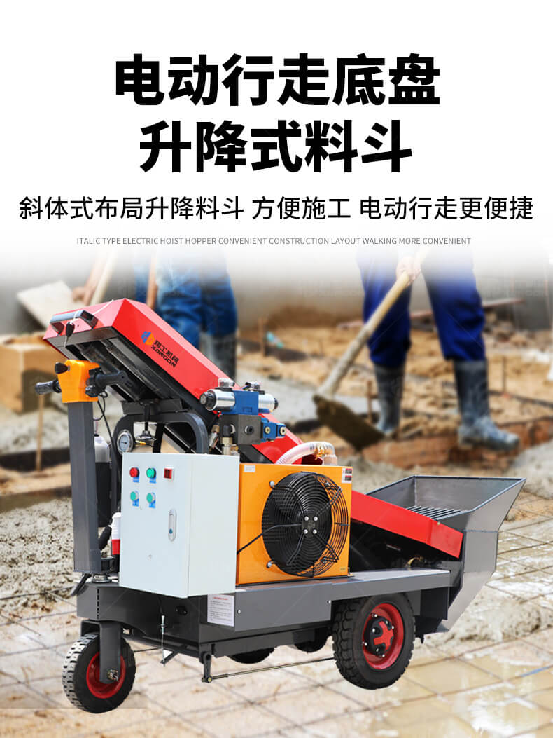 采用電動行走底盤,斜體式布局升降料斗,采用雙排風(fēng)冷散熱系統(tǒng)散熱效果更好,液壓系統(tǒng)采用國內(nèi)知名廠商葉片泵,故障率低,壽命更長,性能更穩(wěn)定,超長行程料缸大大提高了輸送效率。