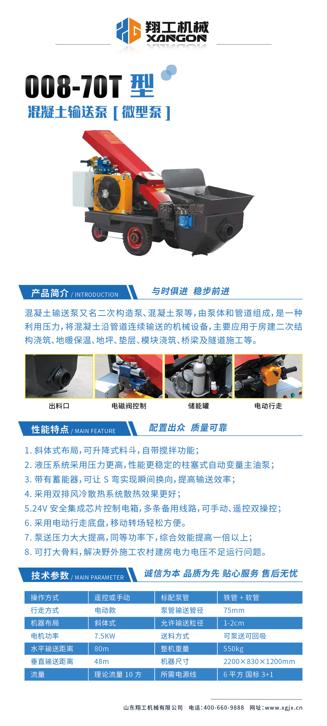 采用電動行走底盤,斜體式布局升降料斗,采用雙排風冷散熱系統散熱效果更好,液壓系統采用壓力更高,性能更穩定的柱塞式自動變量主油泵,料斗自帶攪拌功能防止骨料沉淀造成堵管,泵送壓力大大提高,同等功率下,綜合效能提高一倍以上。由于其功率較小,能打大骨料,解決了野外施工,尤其是農村建房電力電壓不足,不能滿足大功率設備運行的問題。