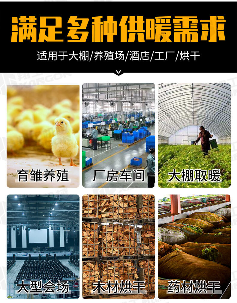 溫室加熱、育雛養殖、畜牧供暖、菌棚保溫、木材解凍、大棚種植保溫等