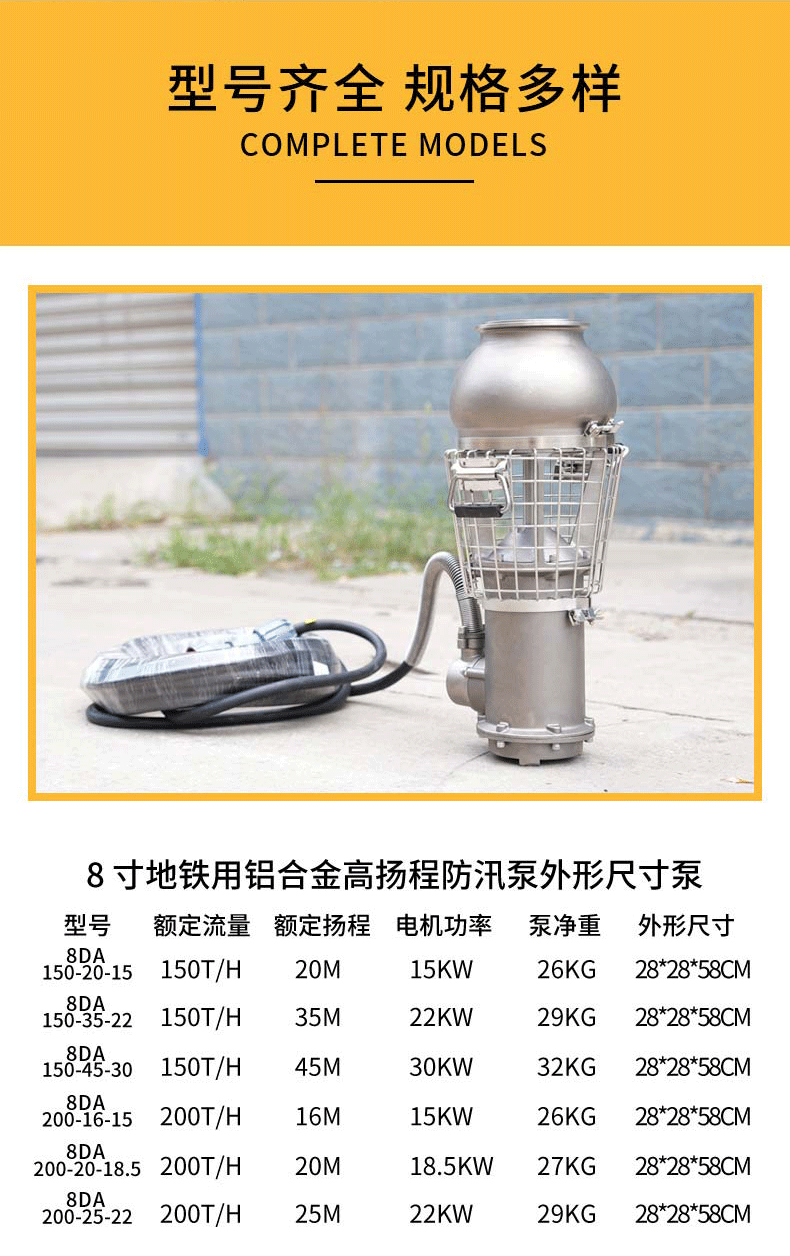 8寸地鐵防汛泵,鋁合金材質,高揚程設計,排水高效,耐腐蝕性強,輕便易移動,專用于地鐵防汛搶險,保障地下空間安全。